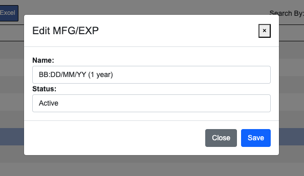 To create a new MFG/EXP Types select the “Add New” action button at the top of the grid. Enter your naming convention into name input field and then click the “Add” button at the bottom to complete the process. Once an entry is created it cannot be deleted. It can however be set to inactive. To do this you will need to select the entries row from the grid by clicking it, then click the “Edit” action button above the grid. In the next window you can then set the status to inactive. See example image below – click to enlarge.