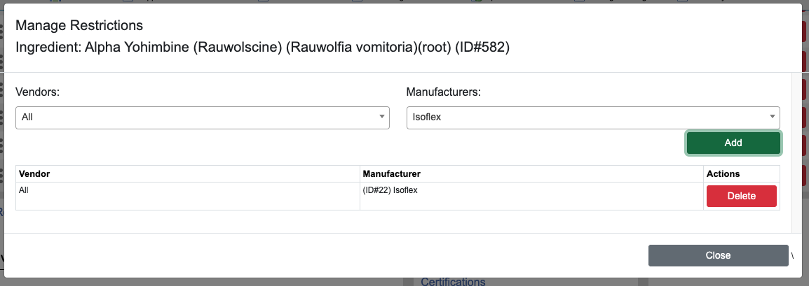 Clicking the “More” text link (2), see example image above – click to enlarge, will display component details like, pricing, allergens, certifications, special care, restrictions and notes. Once the “More” link has been clicked and the component is expanded, click the “Manage Restrictions” button to set Vendor and or Manufacturer restrictions, see example image below – click to enlarge. Setting restrictions will restrict the component to a specific Vendor, Manufacturer or any combination therein. Doing so will allow you to specify specific vendors for batches that can be used on an order from this quote. Multiple restriction combinations can be created for each component. This if often times used to restrict specific vendors to be used on an order if a customer requires specific ingredient sourcing or to stay within predetermined certifications. Example: Vegan, Kosher, Organic, etc. You can create restrictions for every component (ingredients/packaging) within a quote.