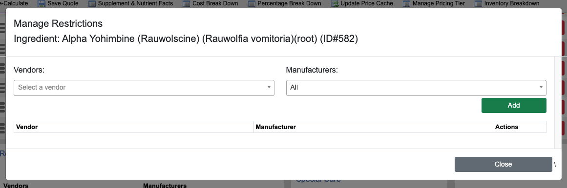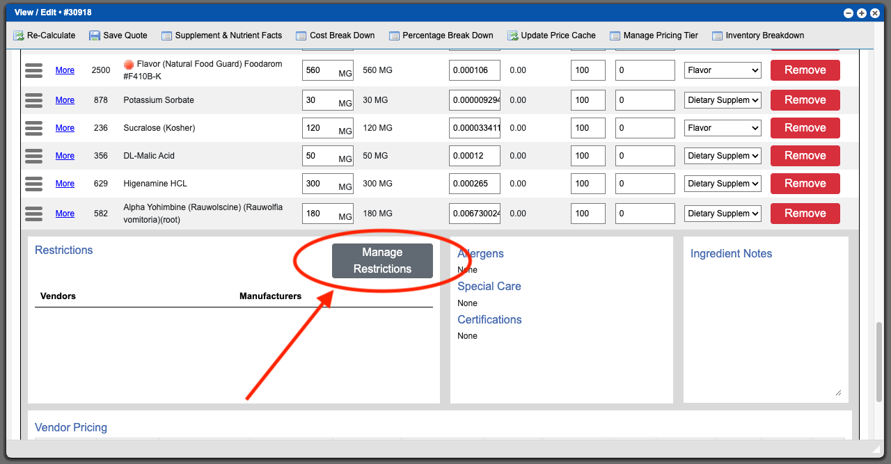 Adding Vendor and Manufacturer restrictions for components (ingredients or packing materials) within a quote is covered above – Please click this link to be automatically be scrolled to the information.
